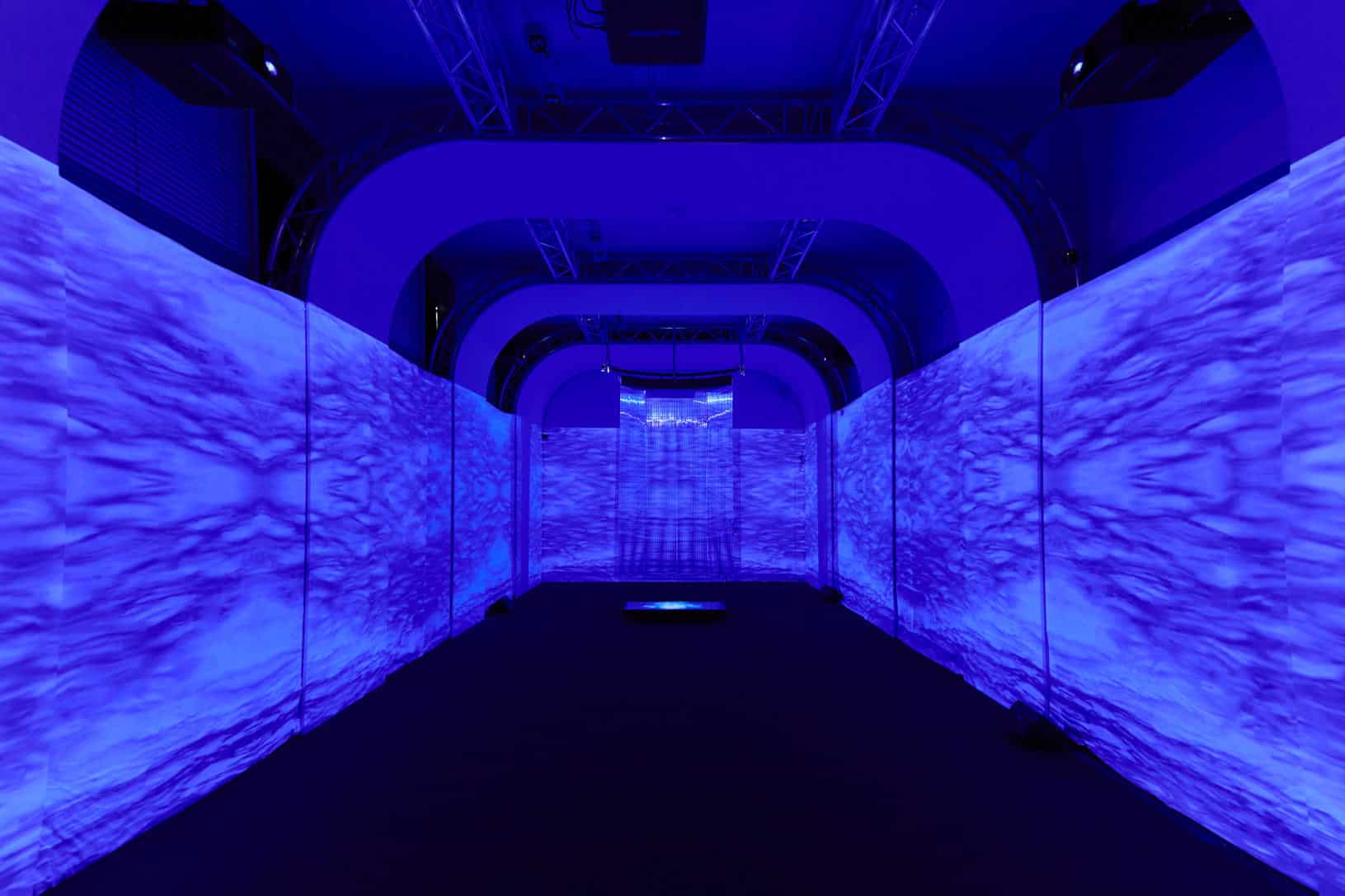 The visual spectacle unfolds through projection mapping, projecting diverse water forms onto three walls of the installation space, creating a dynamic and vibrant atmosphere.
